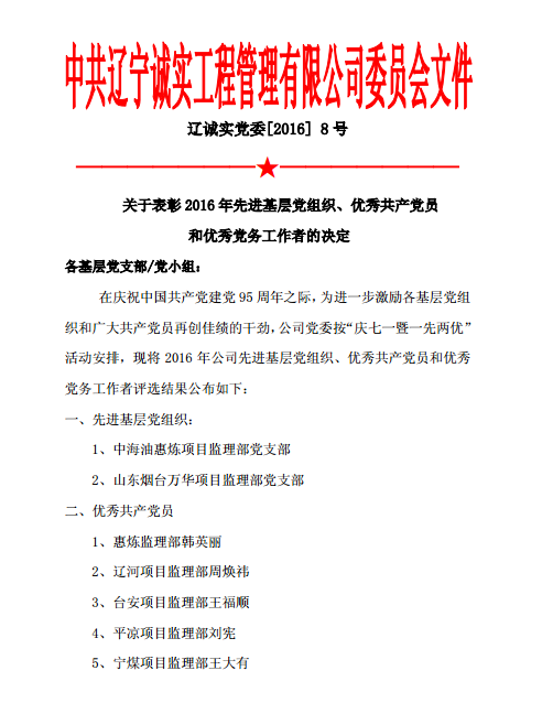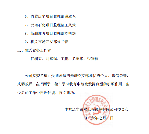 遼寧誠實工程管理有限公司黨委召開《慶祝建黨95周年暨“一優兩先”表彰視頻大會》