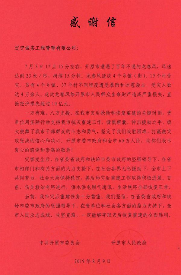 2019年7月3日一場可怕的龍卷風(fēng)席卷了遼寧省開原市,據(jù)初步統(tǒng)計,這場災(zāi)害共造成6人死亡、190余人受傷、2.8萬人受災(zāi),房屋受損6451戶,農(nóng)業(yè)大棚受損25棟,農(nóng)田受災(zāi)14.6萬畝,100余萬平方米廠房遭受嚴(yán)重?fù)p壞,造成直接經(jīng)濟(jì)損失約10.75萬元。災(zāi)情發(fā)生后,省委、省政府及省住建廳領(lǐng)導(dǎo)高度重視,號召全省監(jiān)理企業(yè)為此次災(zāi)情捐款。龍卷風(fēng)無情,人有情。為了幫助受災(zāi)同胞共渡難關(guān),我單位積極響應(yīng)省委、省政府、省建設(shè)廳以及省協(xié)會的號召,在第一時間捐款3000元。參與此次捐款的省監(jiān)理單位共計近30家,捐款數(shù)額從500元至20000元不等。事后,開原市委、開原市政府為我單位頒發(fā)了感謝信以及捐贈證書。