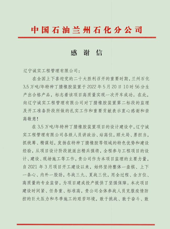 近日,由我公司監(jiān)理的中國石油天然氣股份有限公司蘭州石化分公司--3.5萬砘/年特種丁腈橡膠項(xiàng)目喜獲業(yè)主表揚(yáng)信。表揚(yáng)信充分肯定了誠實(shí)監(jiān)理的工作成果,對(duì)駐蘭州項(xiàng)目部全體監(jiān)理工程師在項(xiàng)目建設(shè)過程中所付出的努力表示由衷的感謝。