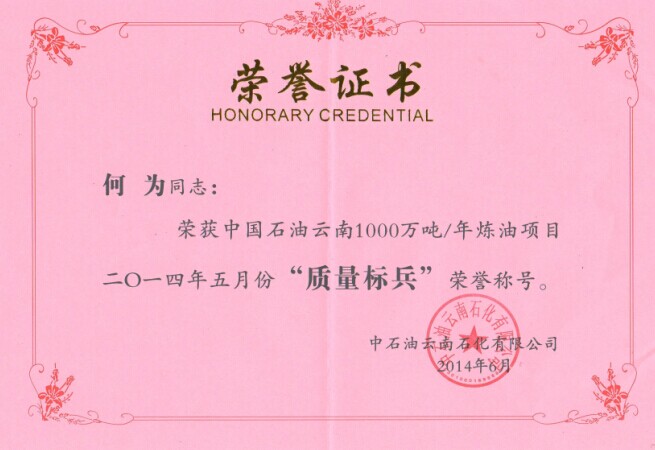 表彰:云南項(xiàng)目部何為同志榮獲中國(guó)石油云南1000萬(wàn)噸/年煉油項(xiàng)目2014年5月份“質(zhì)量標(biāo)兵“榮譽(yù)稱號(hào)