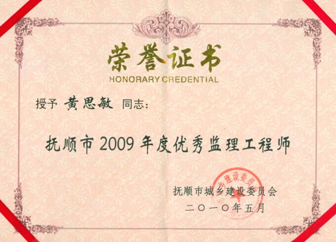 黃思敏同志被評為撫順市年度優秀監理工程師